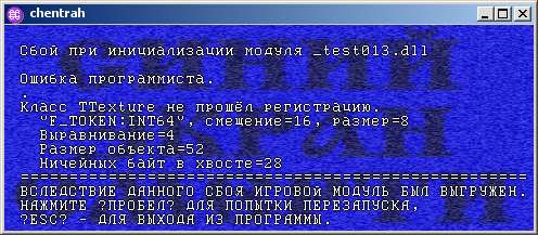 Баг ФриПаскаля №4605 (исключения в dll для Windows не ловятся) практически сводил на нет применимость самой архитектуры Chentrah, поскольку любое исключение в игровом модуле под Windows пробивало до модуля-матки, и программе оставалось только убиться об стенку: такие пряники, как, например, автосохранение при крахе рендера были просто невозможны.